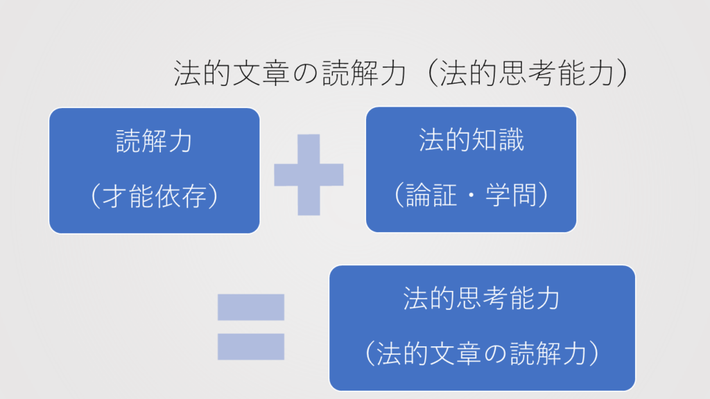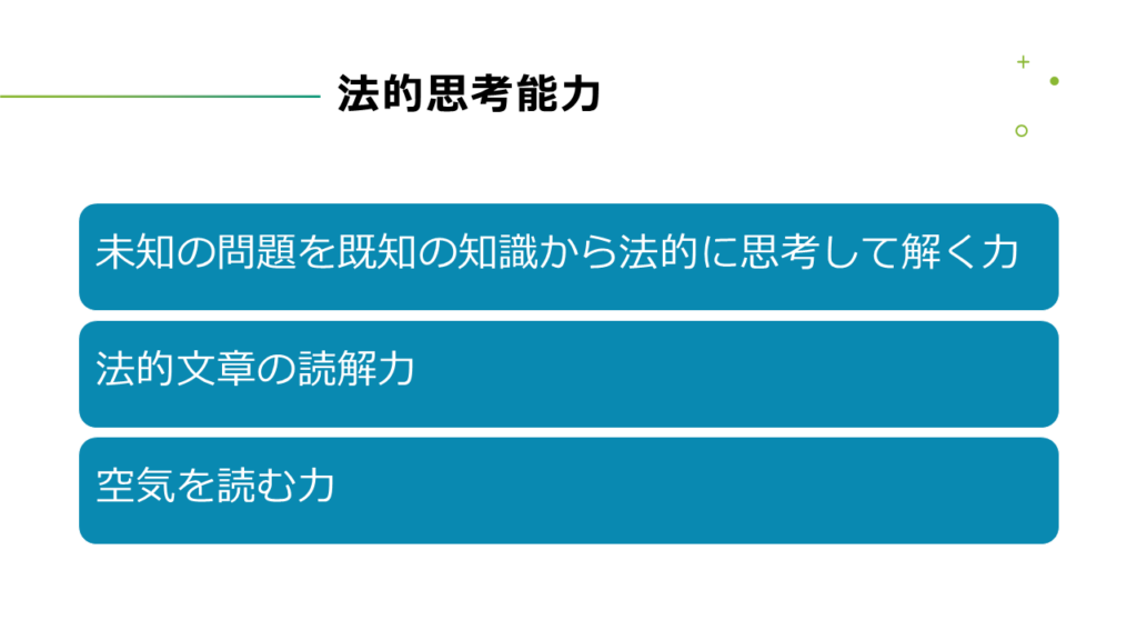 法的思考能力とは一般的には法的知識の体系的な理解を意味します。私は、法的知識の体系的な理解とは、基本的知識の修得のことを意味すると考えています。そして、法的思考能力とは、未知の問題を既知の知識から法的に思考して解く力のことであり、法的文章の読解力のことであると考えています。より抽象的にいえば、空気を読む力です。