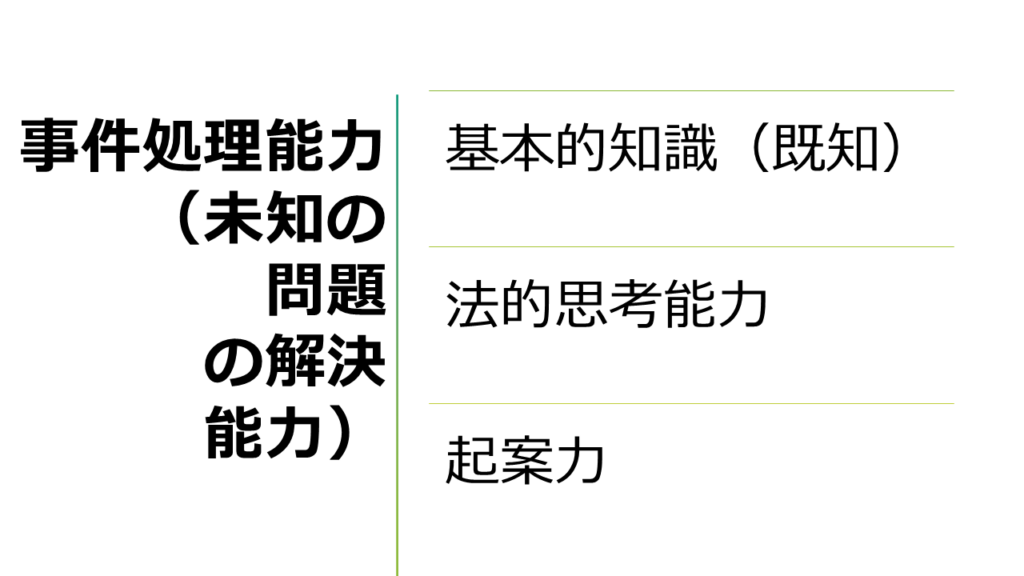 私は、事件処理能力は、➀基本的知識(受験生が本試験時に思い出せる既知の知識)、②法的思考能力(リーガルマインド)、③起案力(法的文章作成能力)で構成されると考えています。