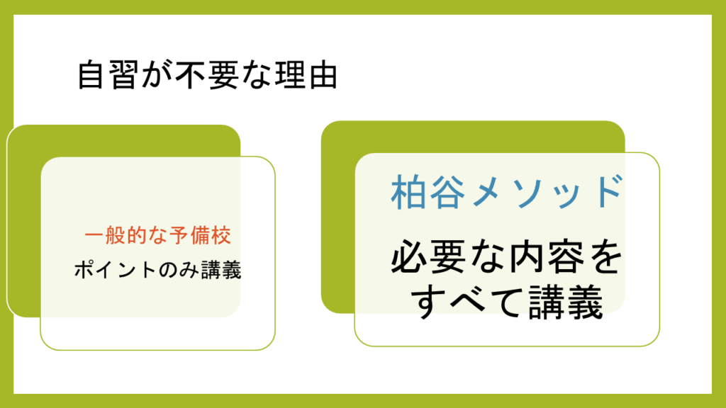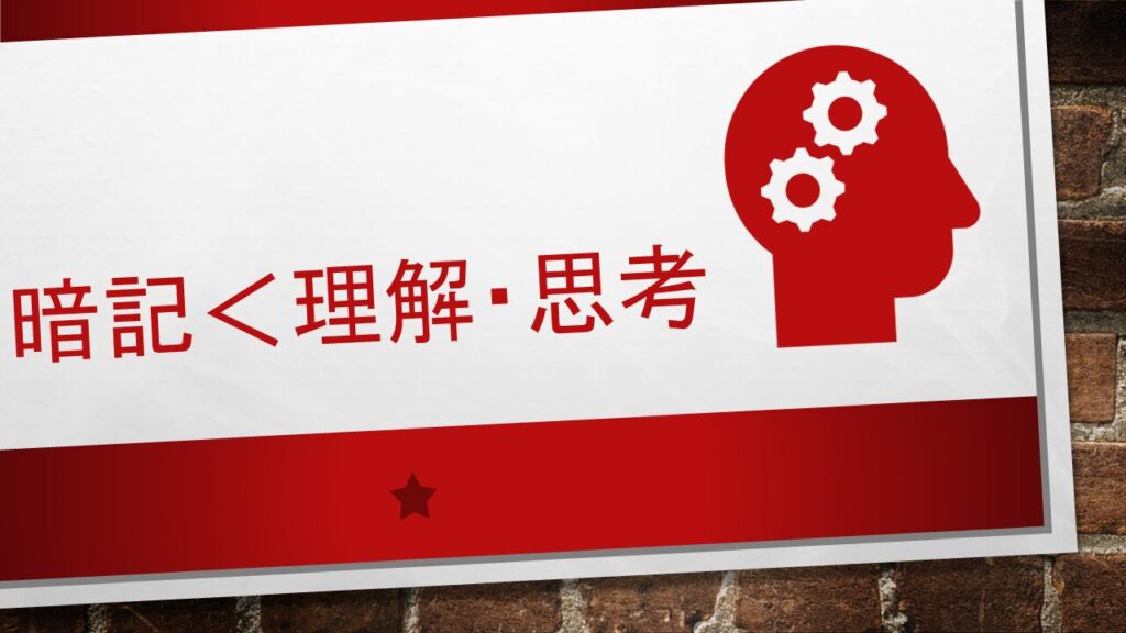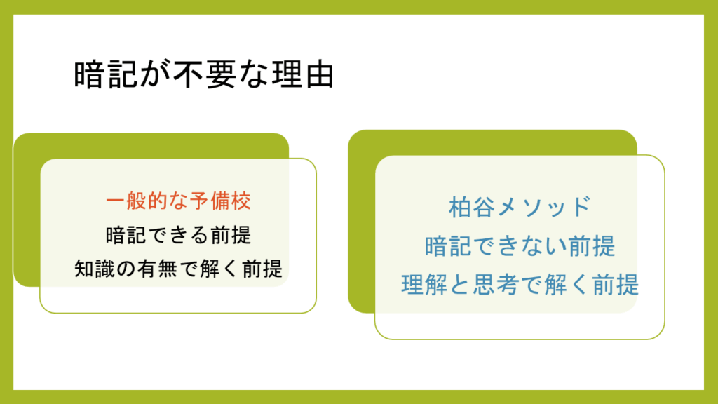 柏谷メソッドでは、暗記は不要です。大事な内容は自然と繰り返しインプットすることで記憶に定着します。一般的な予備校では暗記はできる前提であり、知識で問題を解く前提です。これに対して、柏谷メソッドでは、暗記できない前提、理解と思考で解く前提です。