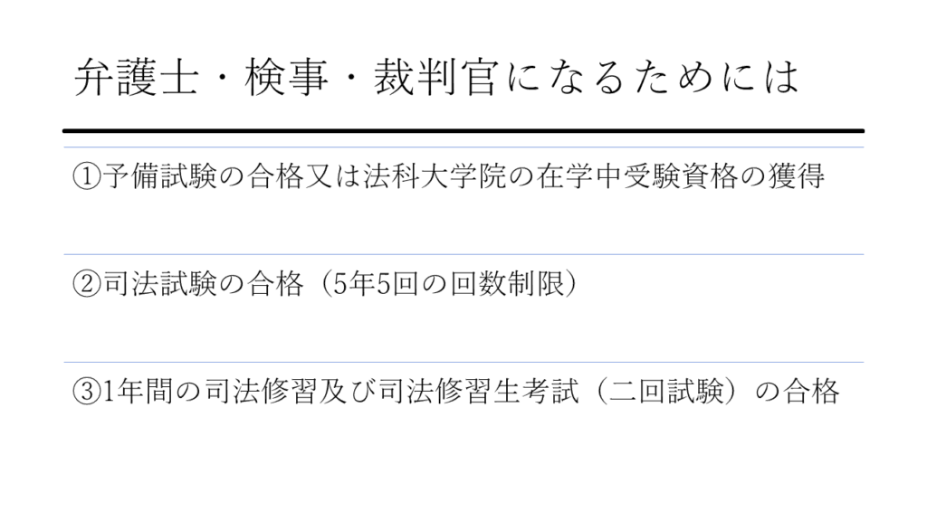 弁護士、検事、裁判官(法律実務家・法曹実務家)になるためには、司法試験に合格して、司法研修所で一年間の司法修習を経る必要があります。
