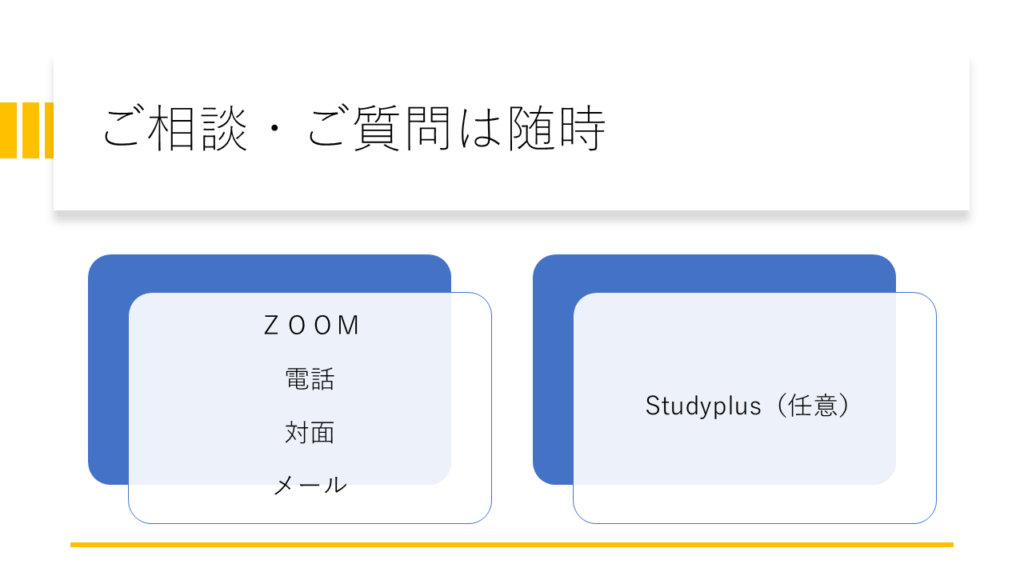 本講座では、私が直接、質問・相談に対応し、学修管理を行っています。受講中いつでも直接質問でき、オンラインの個別面談を受けることができます。また、日々の学修記録をつけていただくことで、モチベーションを維持することもできます。