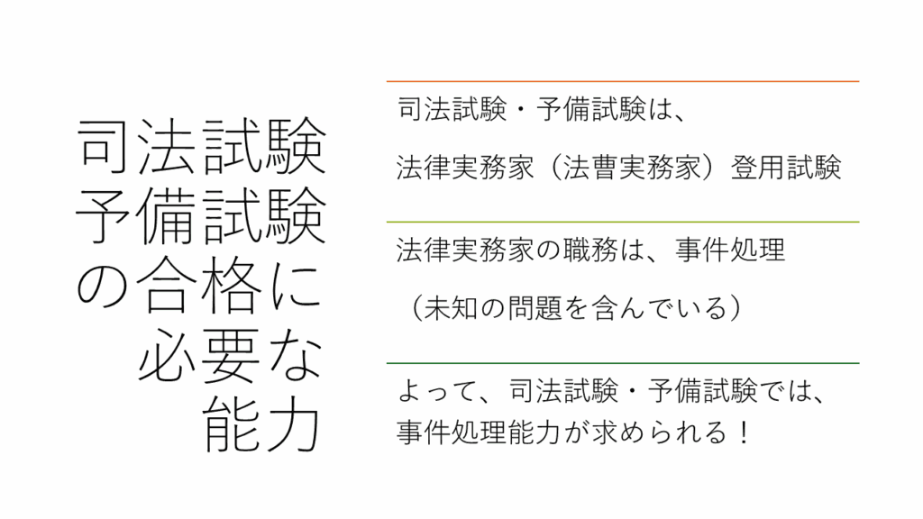 したがって、司法試験や予備試験では、事件処理能力が求められることになります。