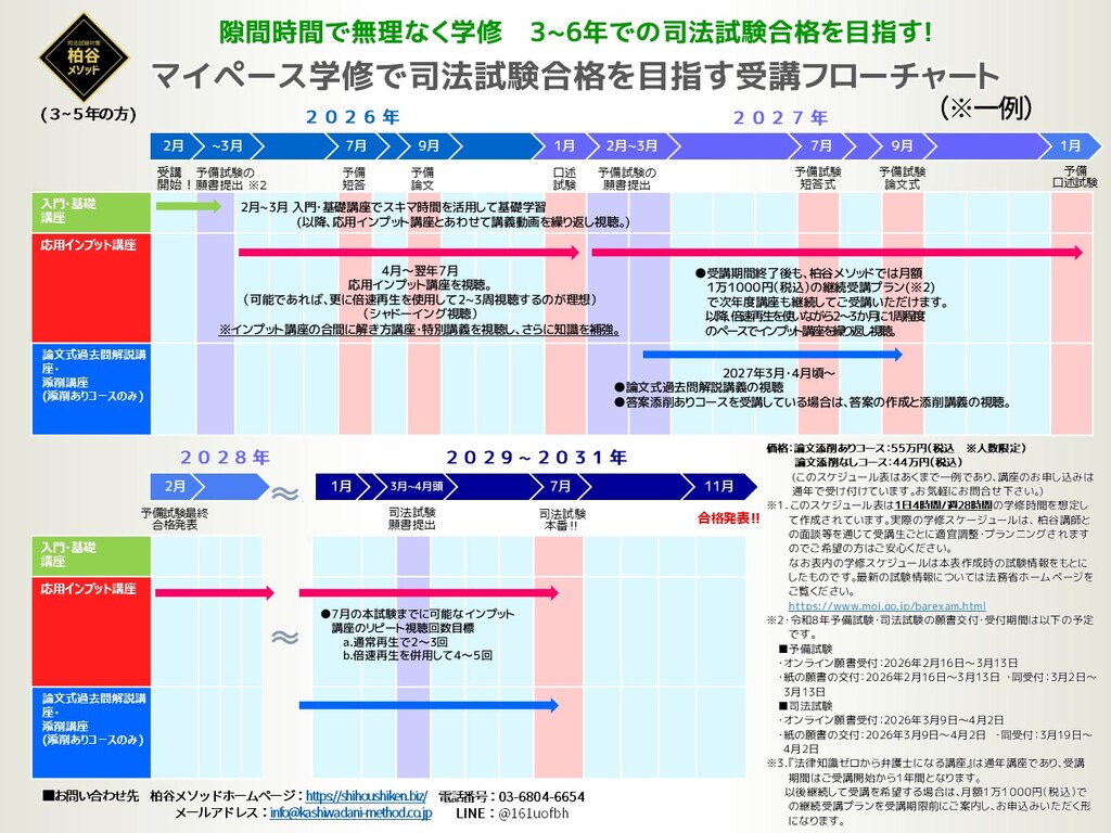 柏谷メソッド「法律知識ゼロから弁護士になる講座」は、論文添削の有無で2つのコースに分かれています。ご自身の学修計画に応じてご選択ください。迷われる場合にはご状況をおうかがいした上で最適なコースをご提案いたしますので、お気軽にお問い合わせください。