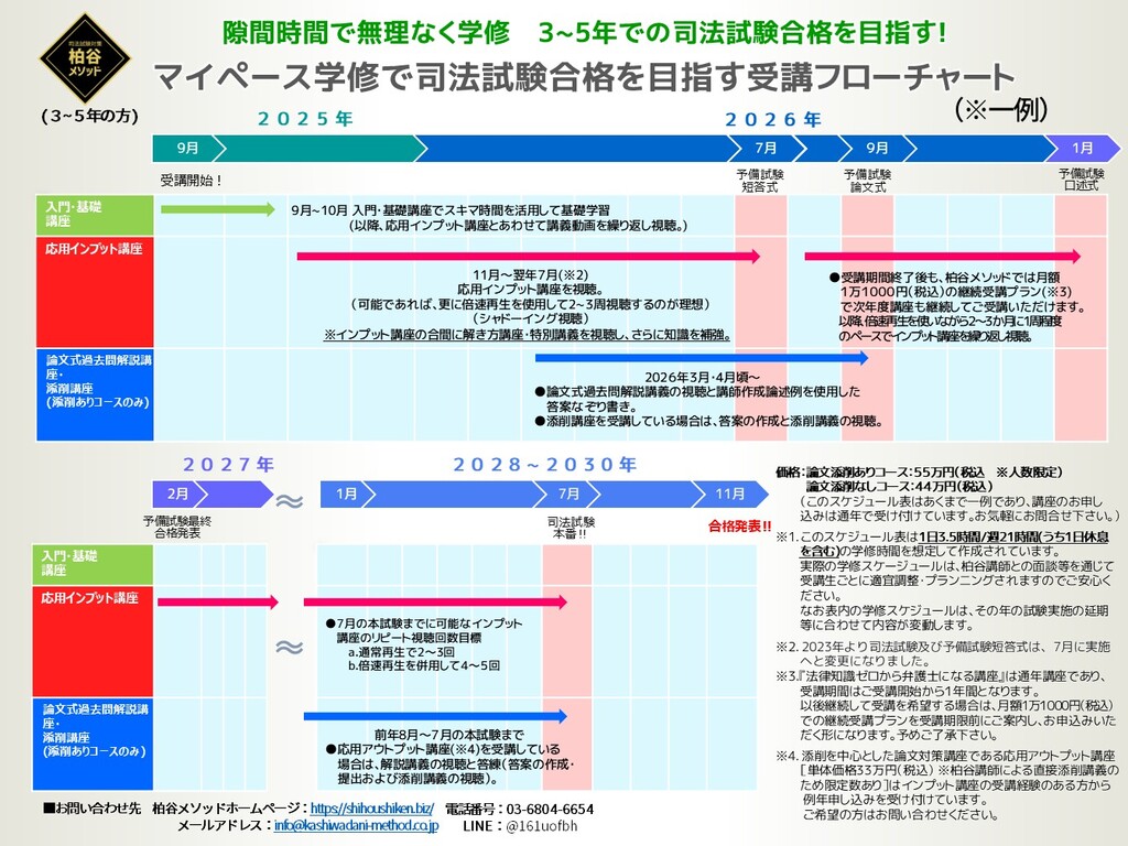『法律知識ゼロから弁護士になる講座』は、これまで法律学修経験者向けに開講していた既存の講座に、初学者向けの短答式対策講座「入門・基礎講座」を加えた、柏谷メソッドの法律初学者向けパッケージ講座です。入門レベルから始めることで、法律初学者の方も安心して学修を進めることができます。